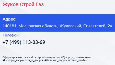 Жуков Строй-Газ по адресу 140181, Московская область, Жуковский, Спасателей, 2а в дальнейшем Организация, размещена в следующих категориях: