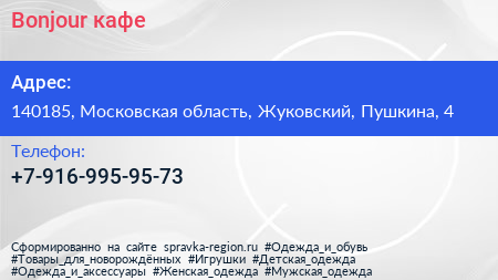 Bonjour, кафе по адресу 140185, Московская область, Жуковский, Пушкина, 4 в дальнейшем Организация, размещена в следующих категориях: