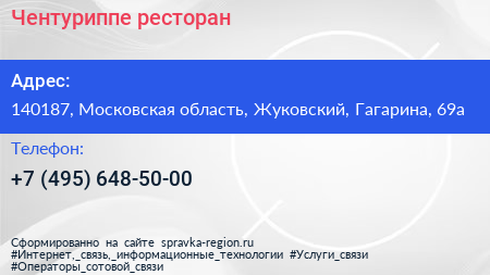 Чентуриппе, ресторан по адресу 140187, Московская область, Жуковский, Гагарина, 69а в дальнейшем Организация, размещена в следующих категориях:
