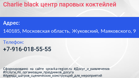 Charlie black, центр паровых коктейлей по адресу 140185, Московская область, Жуковский, Маяковского, 9 в дальнейшем Организация, размещена в следующих категориях: