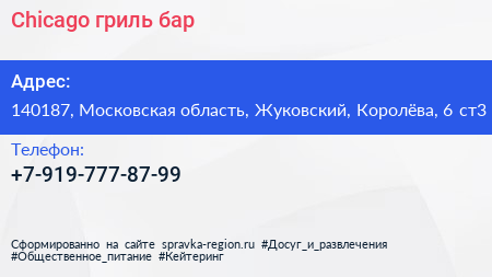 Chicago, гриль-бар по адресу 140187, Московская область, Жуковский, Королёва, 6 ст3 в дальнейшем Организация, размещена в следующих категориях: