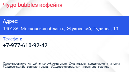 Чудо bubbles, кофейня по адресу 140186, Московская область, Жуковский, Гудкова, 13 в дальнейшем Организация, размещена в следующих категориях: