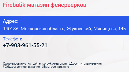 Firebutik, магазин фейерверков по адресу 140186, Московская область, Жуковский, Мясищева, 14Б в дальнейшем Организация, размещена в следующих категориях: