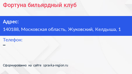 Фортуна, бильярдный клуб по адресу 140188, Московская область, Жуковский, Келдыша, 1 в дальнейшем Организация, размещена в следующих категориях: