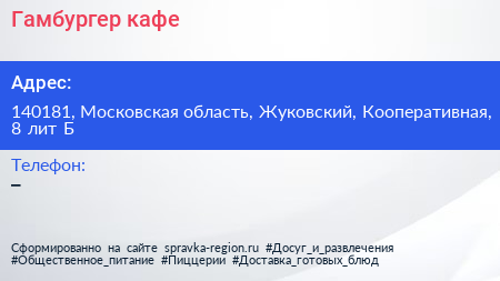 Гамбургер, кафе по адресу 140181, Московская область, Жуковский, Кооперативная, 8 лит Б в дальнейшем Организация, размещена в следующих категориях: