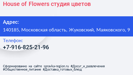 House of Flowers, студия цветов по адресу 140185, Московская область, Жуковский, Маяковского, 9 в дальнейшем Организация, размещена в следующих категориях: