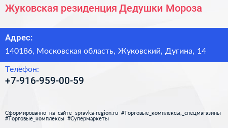 Жуковская резиденция Дедушки Мороза по адресу 140186, Московская область, Жуковский, Дугина, 14 в дальнейшем Организация, размещена в следующих категориях: