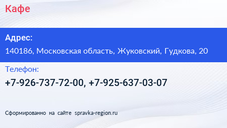 Кафе по адресу 140186, Московская область, Жуковский, Гудкова, 20 в дальнейшем Организация, размещена в следующих категориях: