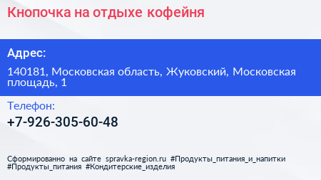 Кнопочка на отдыхе, кофейня по адресу 140181, Московская область, Жуковский, Московская площадь, 1 в дальнейшем Организация, размещена в следующих категориях: