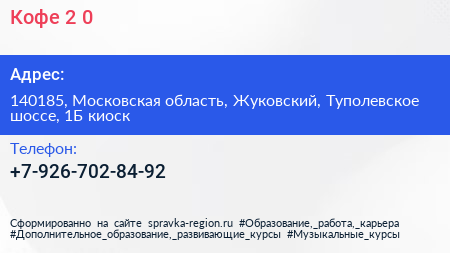 Кофе 2.0 по адресу 140185, Московская область, Жуковский, Туполевское шоссе, 1Б киоск в дальнейшем Организация, размещена в следующих категориях: