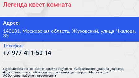 Легенда, квест-комната по адресу 140181, Московская область, Жуковский, улица Чкалова, 35 в дальнейшем Организация, размещена в следующих категориях: