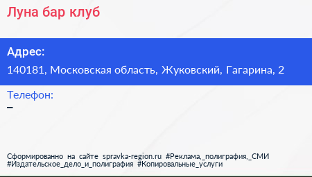 Луна, бар-клуб по адресу 140181, Московская область, Жуковский, Гагарина, 2 в дальнейшем Организация, размещена в следующих категориях: