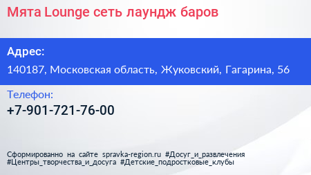 Мята Lounge, сеть лаундж-баров по адресу 140187, Московская область, Жуковский, Гагарина, 56 в дальнейшем Организация, размещена в следующих категориях: