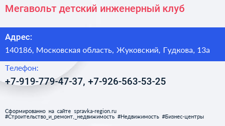 Мегавольт, детский инженерный клуб по адресу 140186, Московская область, Жуковский, Гудкова, 13а в дальнейшем Организация, размещена в следующих категориях:
