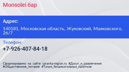 Monsolei, бар по адресу 140181, Московская область, Жуковский, Маяковского, 26/7 в дальнейшем Организация, размещена в следующих категориях: