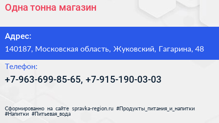 Одна тонна, магазин по адресу 140187, Московская область, Жуковский, Гагарина, 48 в дальнейшем Организация, размещена в следующих категориях: