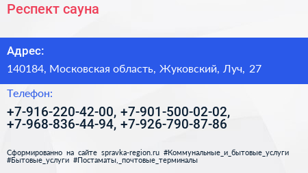 Респект, сауна по адресу 140184, Московская область, Жуковский, Луч, 27 в дальнейшем Организация, размещена в следующих категориях: