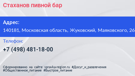 Стаханов, пивной бар по адресу 140181, Московская область, Жуковский, Маяковского, 26 в дальнейшем Организация, размещена в следующих категориях: