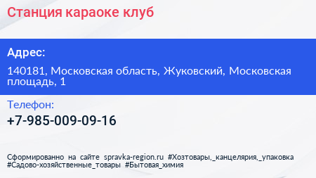 Станция, караоке-клуб по адресу 140181, Московская область, Жуковский, Московская площадь, 1 в дальнейшем Организация, размещена в следующих категориях: