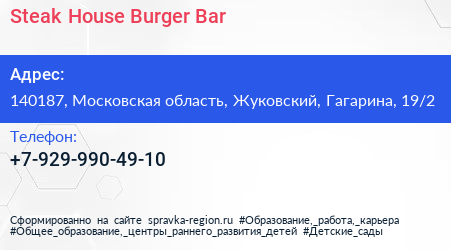 Steak House Burger Bar по адресу 140187, Московская область, Жуковский, Гагарина, 19/2 в дальнейшем Организация, размещена в следующих категориях: