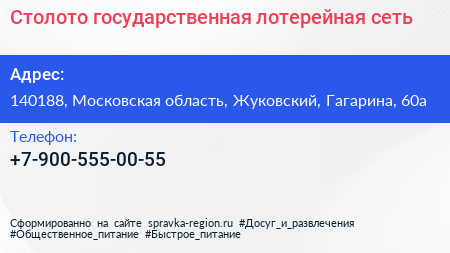 Столото, государственная лотерейная сеть по адресу 140188, Московская область, Жуковский, Гагарина, 60а в дальнейшем Организация, размещена в следующих категориях: