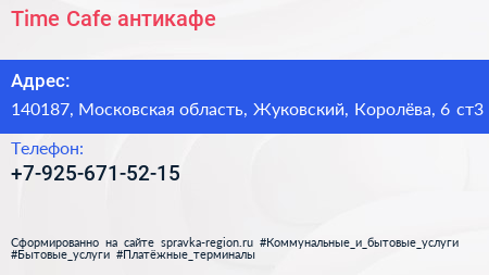 Time Cafe, антикафе по адресу 140187, Московская область, Жуковский, Королёва, 6 ст3 в дальнейшем Организация, размещена в следующих категориях: