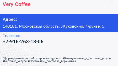 Very Coffee по адресу 140181, Московская область, Жуковский, Фрунзе, 5 в дальнейшем Организация, размещена в следующих категориях: