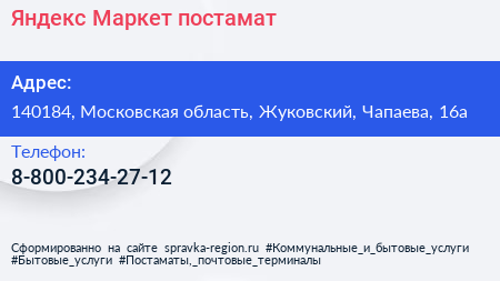 Яндекс.Маркет, постамат по адресу 140184, Московская область, Жуковский, Чапаева, 16а в дальнейшем Организация, размещена в следующих категориях: