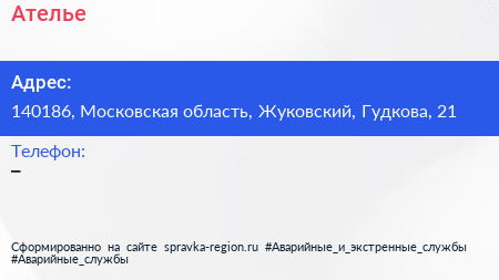 Ателье по адресу 140186, Московская область, Жуковский, Гудкова, 21 в дальнейшем Организация, размещена в следующих категориях: