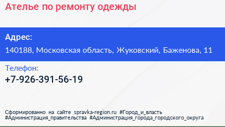 Ателье по ремонту одежды по адресу 140188, Московская область, Жуковский, Баженова, 11 в дальнейшем Организация, размещена в следующих категориях: