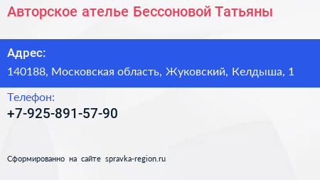 Авторское ателье Бессоновой Татьяны по адресу 140188, Московская область, Жуковский, Келдыша, 1 в дальнейшем Организация, размещена в следующих категориях: