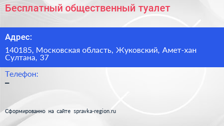 Бесплатный общественный туалет по адресу 140185, Московская область, Жуковский, Амет-хан Султана, 37 в дальнейшем Организация, размещена в следующих категориях: