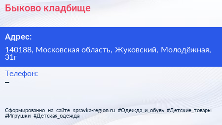Быково, кладбище по адресу 140188, Московская область, Жуковский, Молодёжная, 31г в дальнейшем Организация, размещена в следующих категориях: