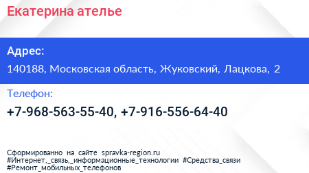 Екатерина, ателье по адресу 140188, Московская область, Жуковский, Лацкова, 2 в дальнейшем Организация, размещена в следующих категориях: