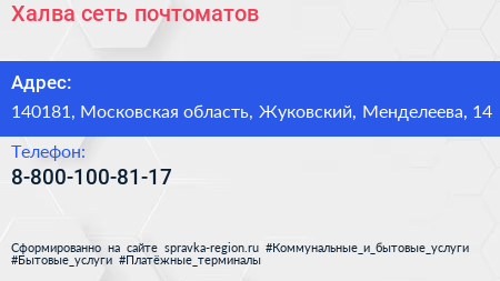 Халва, сеть почтоматов по адресу 140181, Московская область, Жуковский, Менделеева, 14 в дальнейшем Организация, размещена в следующих категориях: