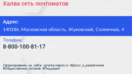 Халва, сеть почтоматов по адресу 140186, Московская область, Жуковский, Солнечная, 4 в дальнейшем Организация, размещена в следующих категориях: