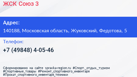 ЖСК Союз-3 по адресу 140188, Московская область, Жуковский, Федотова, 5 в дальнейшем Организация, размещена в следующих категориях: