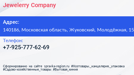 Jewelerry Company по адресу 140186, Московская область, Жуковский, Молодёжная, 15 в дальнейшем Организация, размещена в следующих категориях: