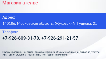 Магазин-ателье по адресу 140186, Московская область, Жуковский, Гудкова, 21 в дальнейшем Организация, размещена в следующих категориях:
