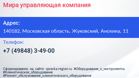 Мира, управляющая компания по адресу 140182, Московская область, Жуковский, Анохина, 11 в дальнейшем Организация, размещена в следующих категориях: