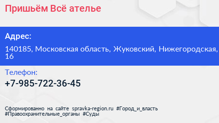 Пришьём Всё, ателье по адресу 140185, Московская область, Жуковский, Нижегородская, 16 в дальнейшем Организация, размещена в следующих категориях: