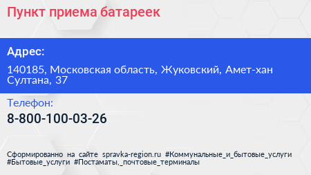 Пункт приема батареек по адресу 140185, Московская область, Жуковский, Амет-хан Султана, 37 в дальнейшем Организация, размещена в следующих категориях: