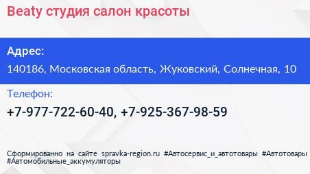 Beaty студия, салон красоты по адресу 140186, Московская область, Жуковский, Солнечная, 10 в дальнейшем Организация, размещена в следующих категориях: