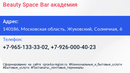 Beauty Space Bar, академия по адресу 140186, Московская область, Жуковский, Солнечная, 6 в дальнейшем Организация, размещена в следующих категориях: