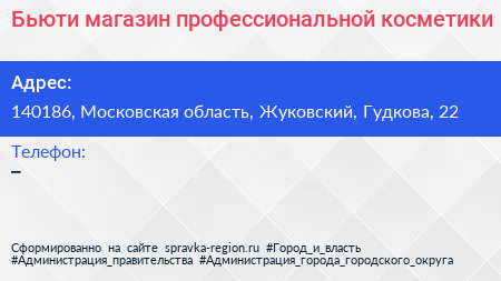 Бьюти, магазин профессиональной косметики по адресу 140186, Московская область, Жуковский, Гудкова, 22 в дальнейшем Организация, размещена в следующих категориях: