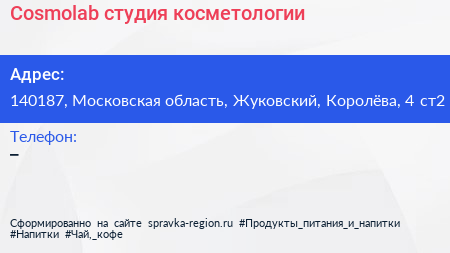 Cosmolab, студия косметологии по адресу 140187, Московская область, Жуковский, Королёва, 4 ст2 в дальнейшем Организация, размещена в следующих категориях: