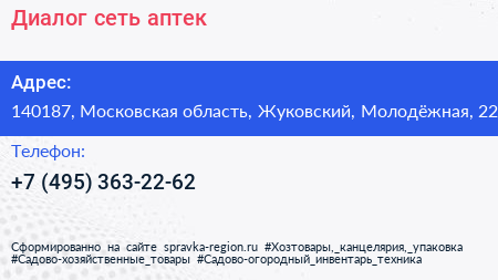 Диалог, сеть аптек по адресу 140187, Московская область, Жуковский, Молодёжная, 22 в дальнейшем Организация, размещена в следующих категориях: