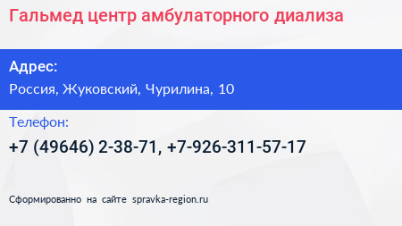 Гальмед, центр амбулаторного диализа по адресу Раменский специализированный дом ребёнка, 10, улица Чурилина, ДНТ НИР "Отдых", Кратово, Раменский городской округ, Московская область, Центральный федеральный округ, 140131, Россия в дальнейшем Организация, размещена в следующих категориях: