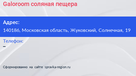 Galoroom, соляная пещера по адресу 140186, Московская область, Жуковский, Солнечная, 19 в дальнейшем Организация, размещена в следующих категориях: