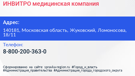 ИНВИТРО, медицинская компания по адресу 140181, Московская область, Жуковский, Ломоносова, 18/11 в дальнейшем Организация, размещена в следующих категориях: